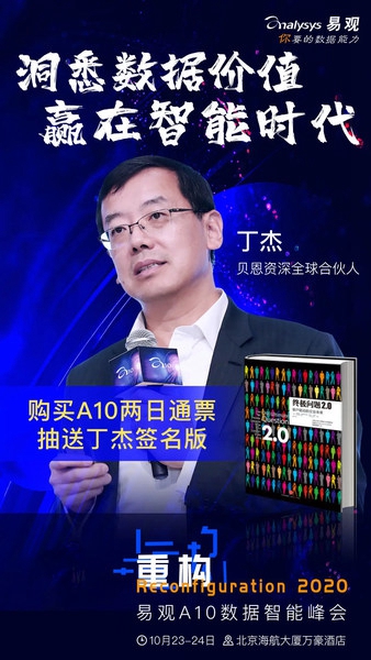 在10月23日举行的易观A10峰会主论坛上,贝恩资深全球合伙人丁杰先生将现场分享贝恩研究的企业数字化战略路线图。10月16日起,购买两日通票享受8折优惠,还可现场抽送贝恩公司丁杰先生亲笔签名版《终极问题2.0:客户驱动的企业未来》。