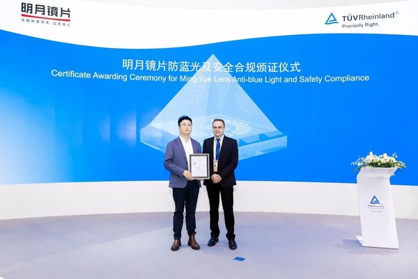 明月镜片通过了TUV莱茵的防蓝光China-mark认证,获颁证书