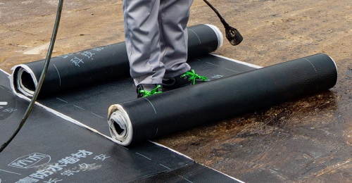 (▲防水卷材大面铺设施工中)