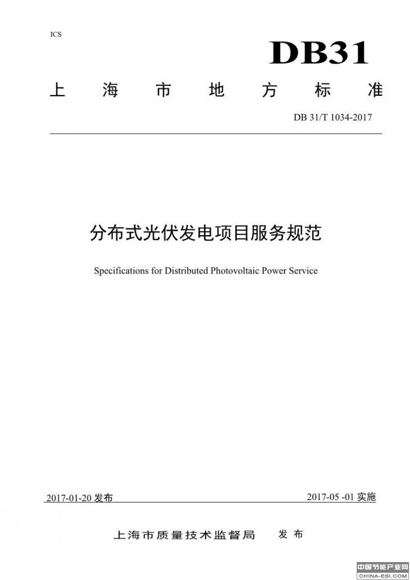 DB31/T1034-2017分布式光伏发电项目服务规范,自2017年5月1日起实施