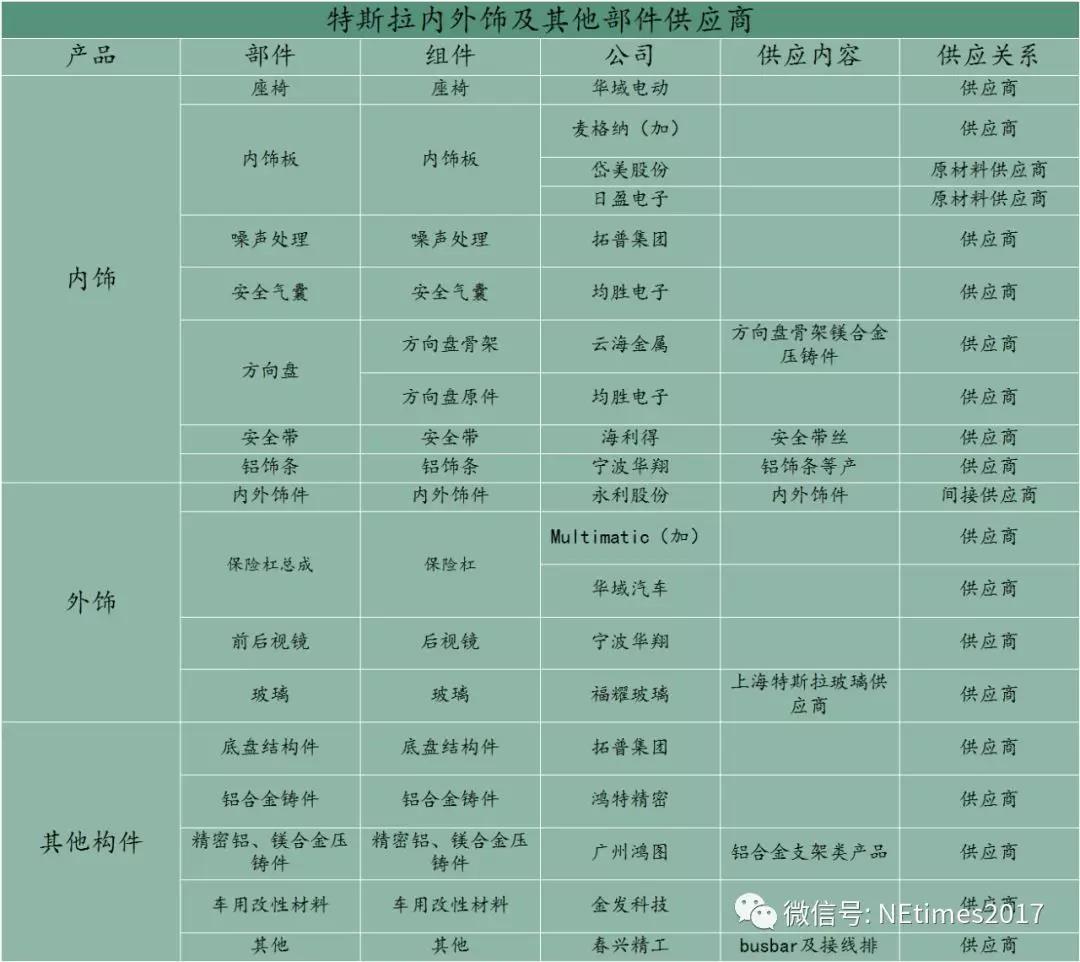 基于此,NE时代特地为大家搜集了特斯拉最新供应链公司,仅供大家参考。