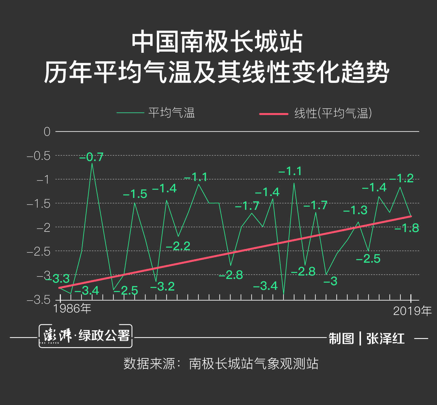 很明显,1986年以来,南极长城站历年平均气温呈线性升高趋势