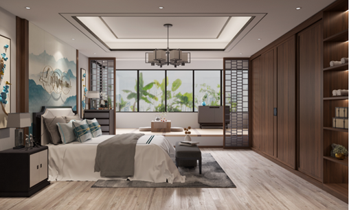 关于中隐,柏厨家居除了对常规空间的打造外,更加入了一些对家庭结构方面的人文关怀思考,这种关怀集中表现在对老人房和儿童房的构建之上。小时候我是你的世界,长大后我要给你一个世界,在打造老人房时充分考虑了中老年人的需求,整个卧室环境清雅大气,新中式床头硬包营造出的“悠然见南山”的安逸意境直接给人以视觉冲击。日常使用方面,带格四门移门衣柜给母亲更从容的收纳小世界,而开放格是父亲的收藏小世界,中式的通透格栅则让榻榻米空间变得更加雅致,闲暇时的一杯香茗,闲聊中往昔的美好尽在杯中回味。