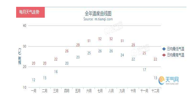 图注:深圳全年温度曲线图,冬季气温最低气温13--22度之间