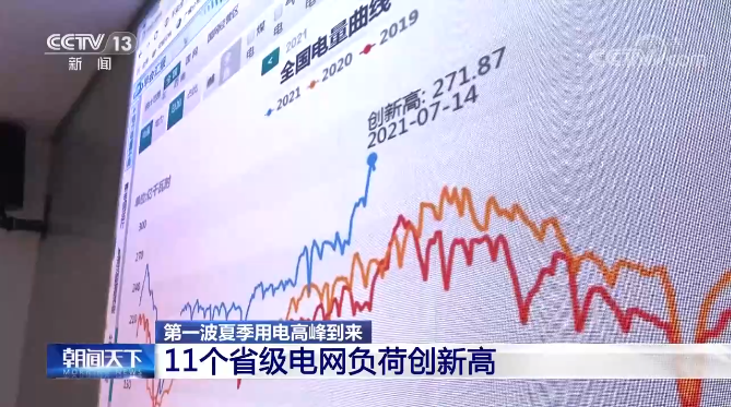 11个省级电网负荷创新高全国日用电量在7月14日刷新了历史纪录,达到271.87亿千瓦时,比去年夏季的最高值增长超过了10%,比今年年初的极端寒潮天气情况下用电量增长也超过了4.7%。国家电力调度控制中心副主任 朱伟江:主要是受天气因素的影响,再叠加上经济快速发展的这么一个态势,所以造成了7月中旬以来用电负荷有一个明显的上升,也就是第一波高峰的到来。