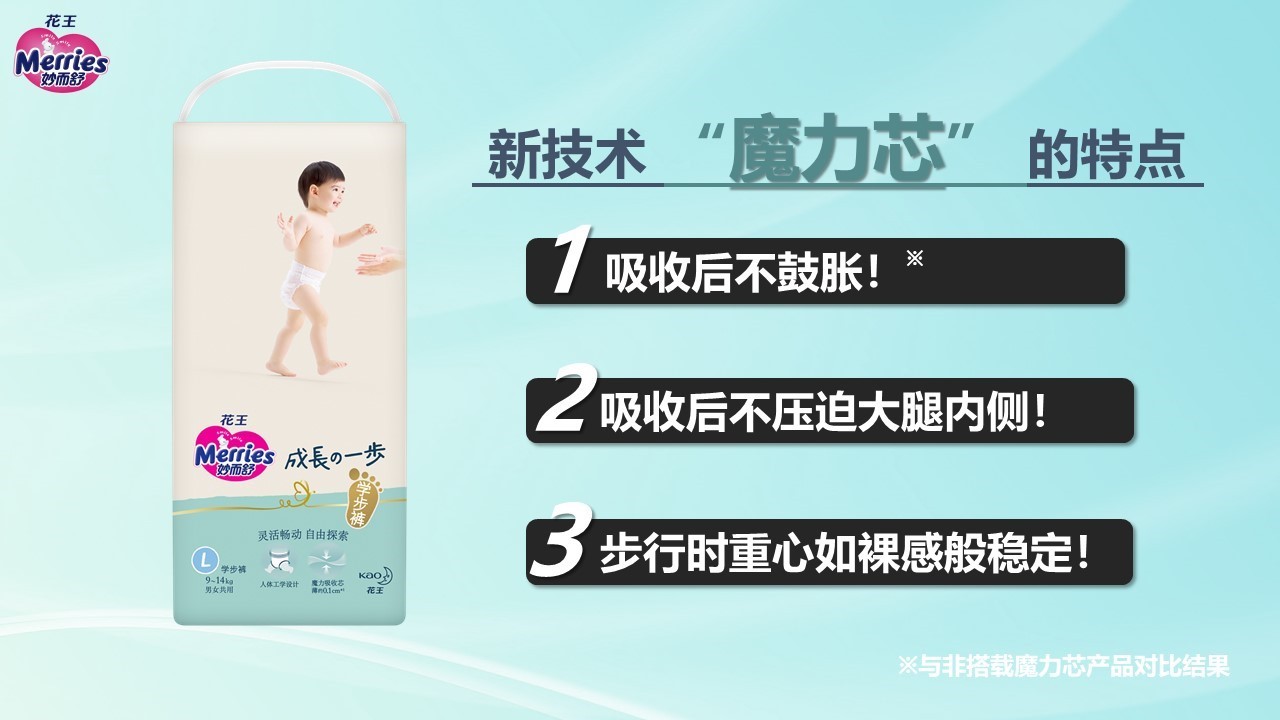 基于以上实际的调查与发现,花王运用集团最先进技术,精心开发出了高品质的“妙而舒成长一步婴儿学步裤”系列产品,期待为助力中国宝宝的健康成长做出新的贡献。其采用“魔力芯技术”打造的“魔力吸收芯”,在吸收尿液后也能保持纤薄,其对大腿内侧所造成的压力减少到了以往产品的一半左右。