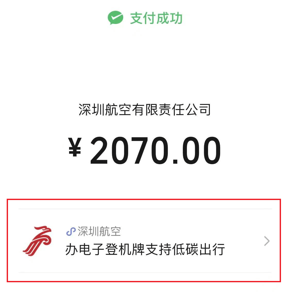 使用微信支付在深圳航空等航司购买机票,点击支付成功页面“低碳出行”入口,即可轻松跳转办理航司线上值机小程序