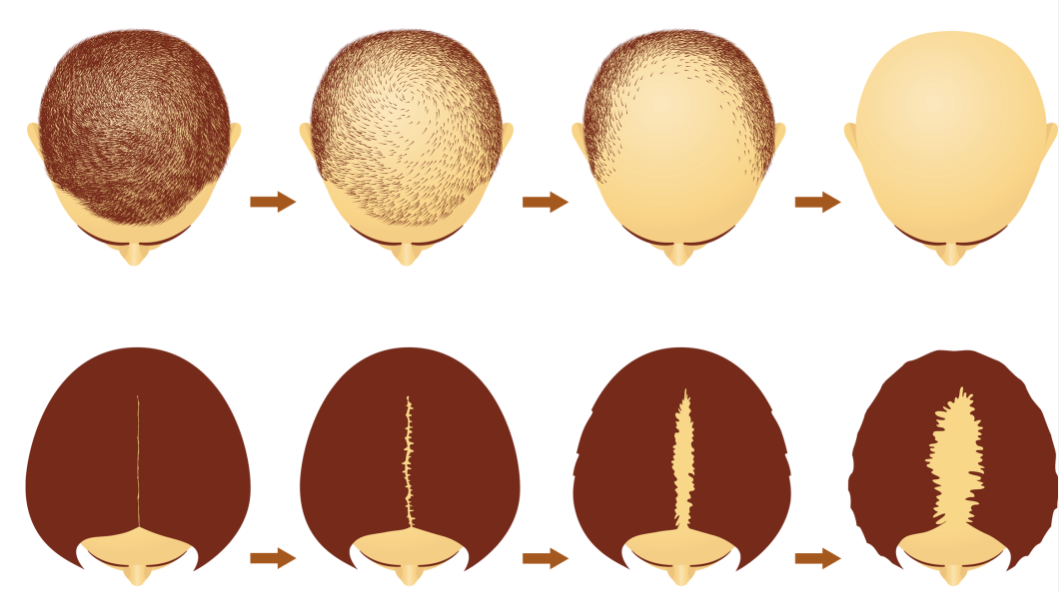 还有一类是雄激素性脱发,它是最常见的一种脱发类型,又称为脂溢性脱发或早秃。主要分为男性型和女性型两种。