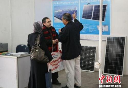 中国(南京)第六届国际新能源展览会上,两位外国客商在与一家中国光伏企业的工作人员洽谈业务。