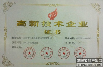 北京2012年3月20日电 /美通社亚洲/ -- 北京索乐阳光能源科技有限公司已于2011年11月21日顺利通过了国家级高新技术企业认证,并于3月17日收到了由北京市科学技术委员会、北京市财政局、北京市国家税务局、北京市地方税务局联合颁发的《高新技术企业证书》。