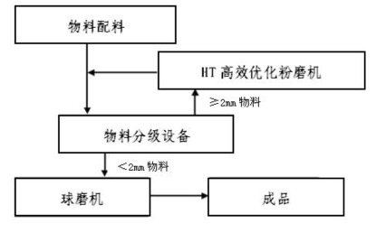 粉磨物料经过计量配料后,进入物料分选设备进行分选,细颗粒物料(粒度<2mm)进入球磨机进行研磨作业;粗颗粒物料(粒度≥2mm)进入HT高效优化粉磨机进行破碎、粉磨,出HT高效优化粉磨机物料,再进入物料分选设备进行分选,分选后的细颗粒物料(粒度<2mm)进入球磨机进行研磨作业,粗颗粒物料(粒度>2mm)返回HT高效优化粉磨机再进行粉碎。进入球磨机的物料经球磨机研磨后,达到一定细度和比表面积要求,出磨后进入成品库。